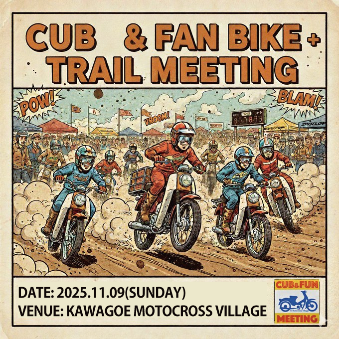 一度参加した方は次の開催を待ち望むと言われるほど、楽しいイベント「カブ&ファンバイク+トレールバイクミーティング」開催のお知らせです。