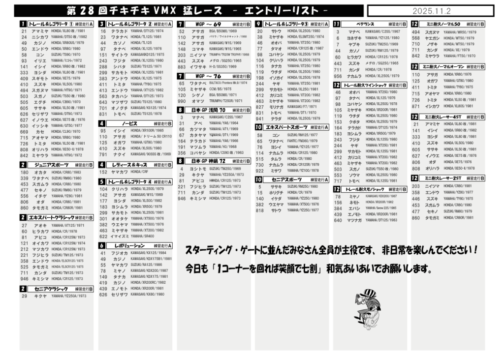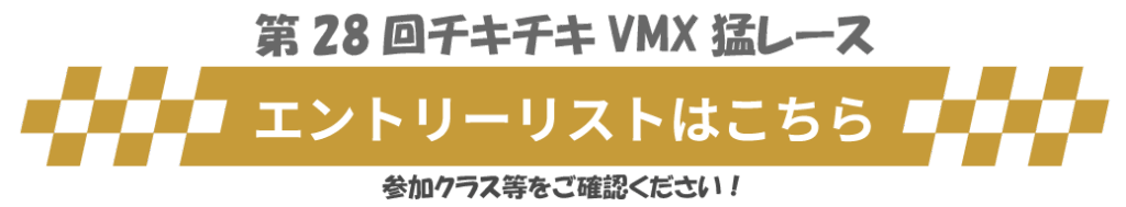 第28回チキチキVMX猛レースのエントリーリストになります。当日参加されるクラス(種目)等を事前に確認できます。下記バナーおよび画像をクリックすると、PDFファイルがダウンロードできます。